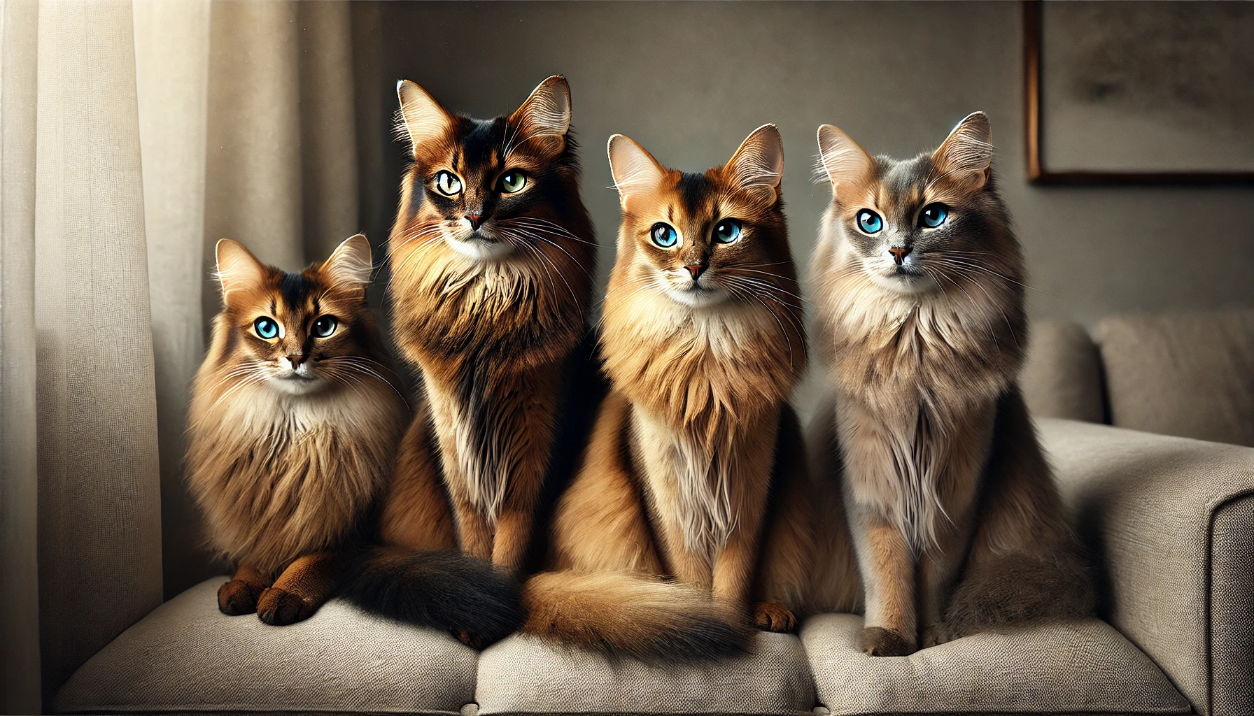 모든 소말리 고양이는 아구티(Agouti) 패턴으로, 털 한 올에 2~3가지 색이 섞여 있어 움직임에 따라 색감이 다채롭게 바뀝니다. 주요 색상은 다음과 같습니다: